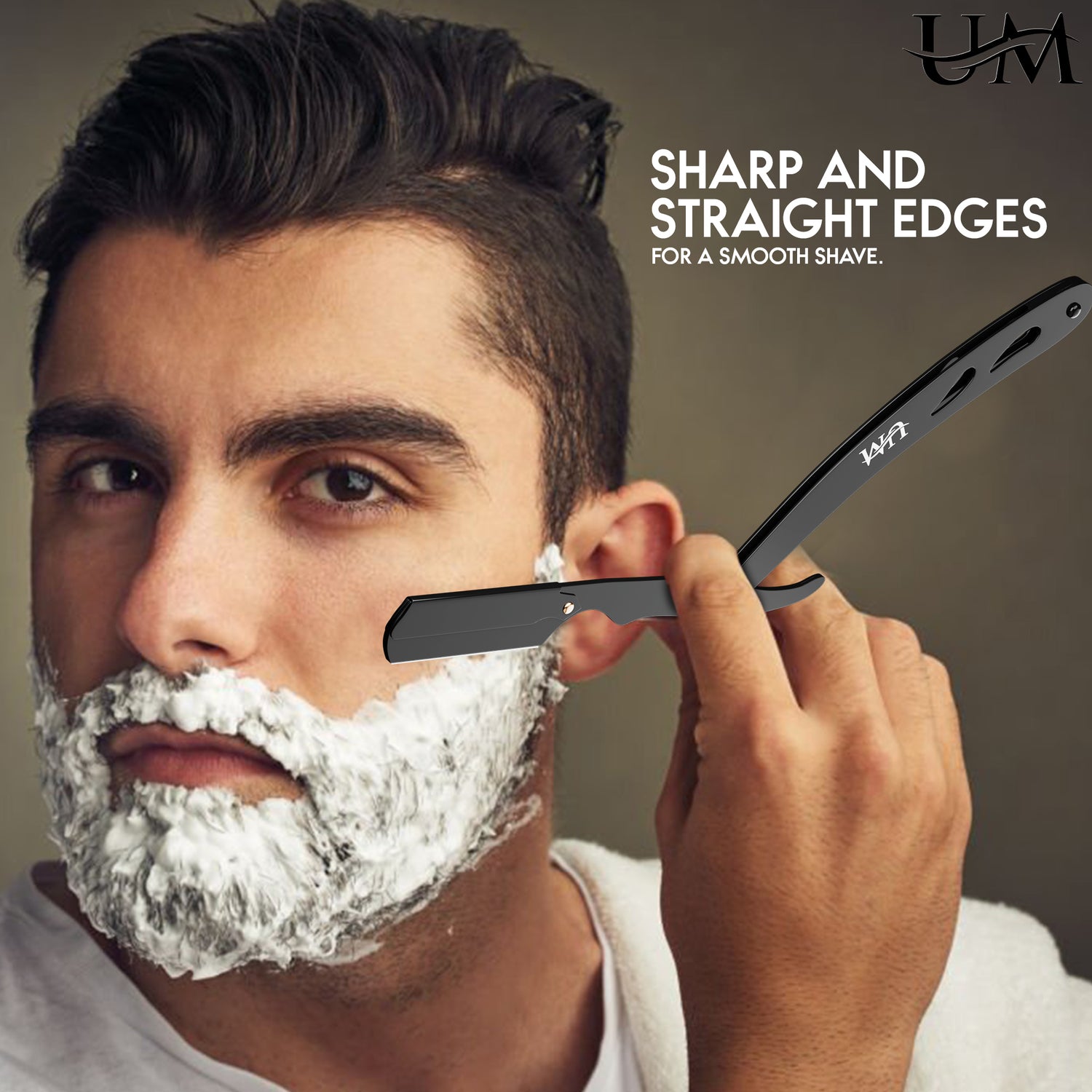 UM Supplies straight blade razor comes with 100 Pack straight blade made with black handle and premium quality stainless steel finish that has been specifically designed to resist rust with complete corrosion resistance. .
